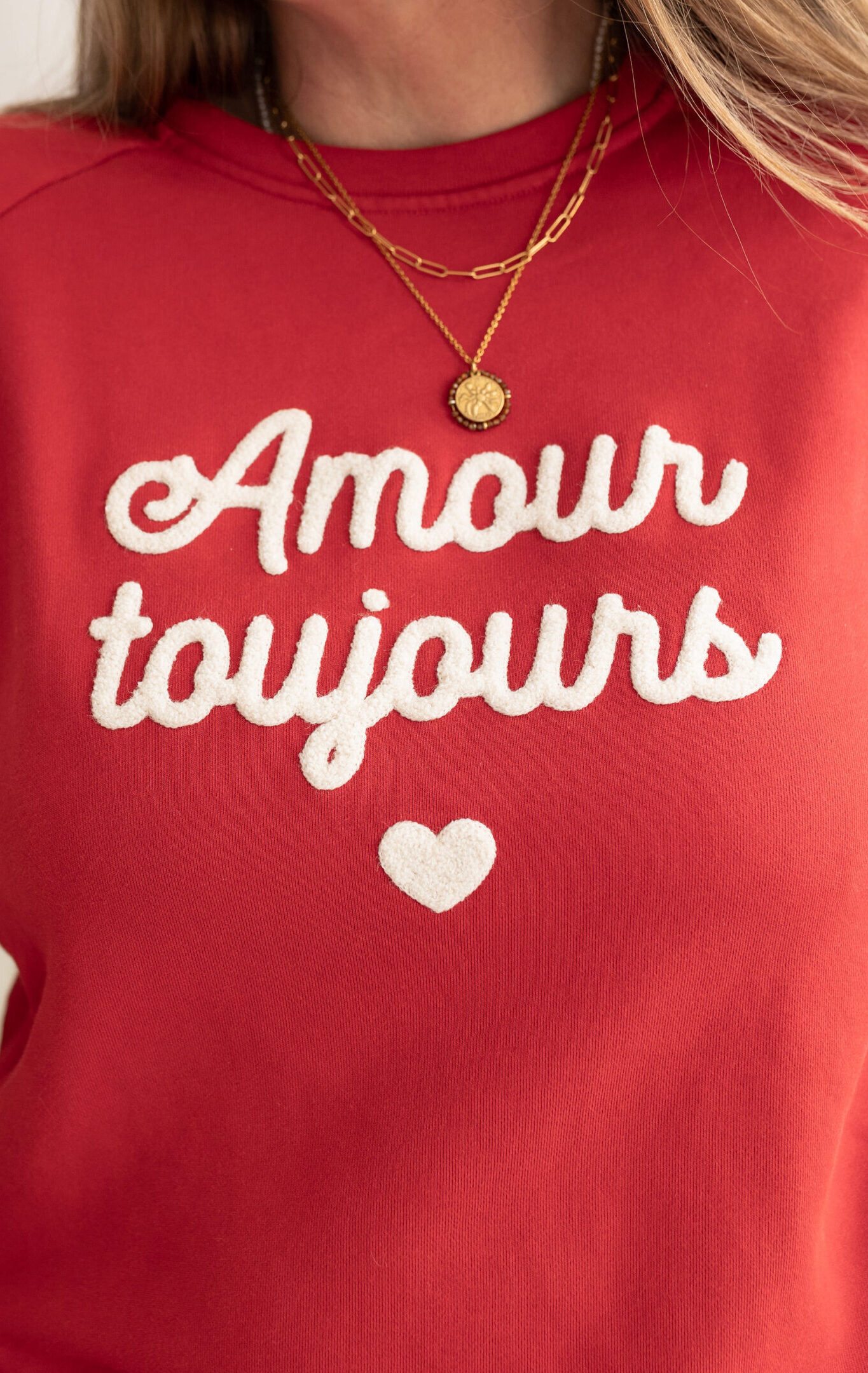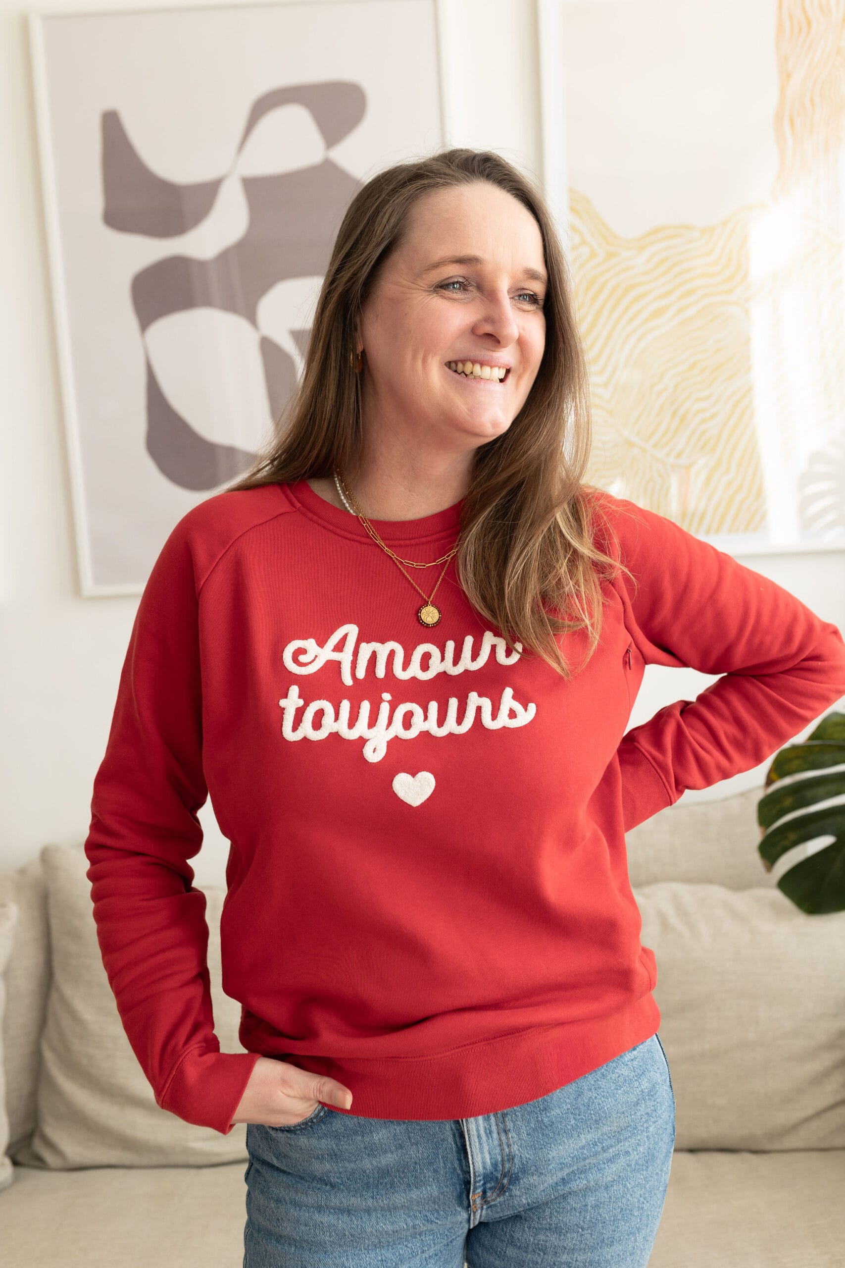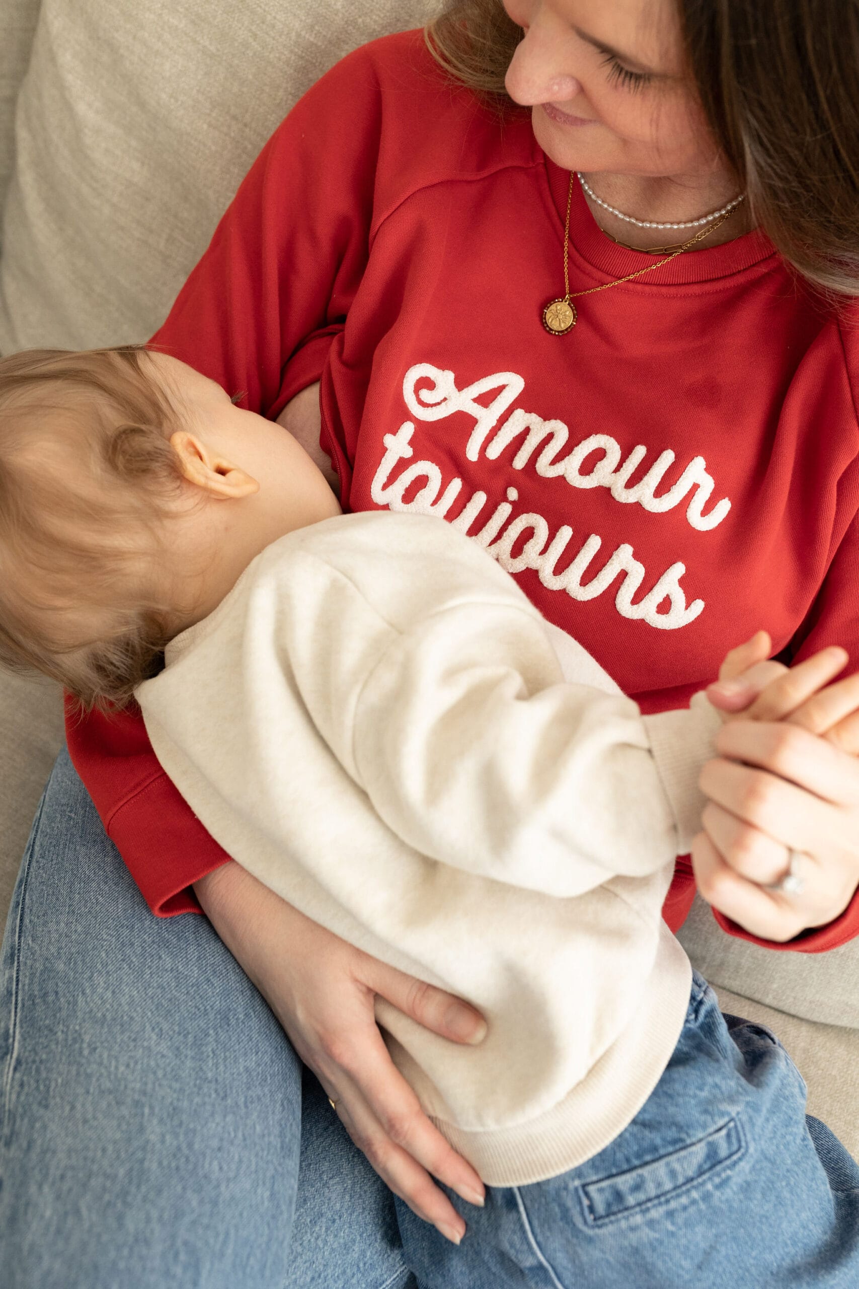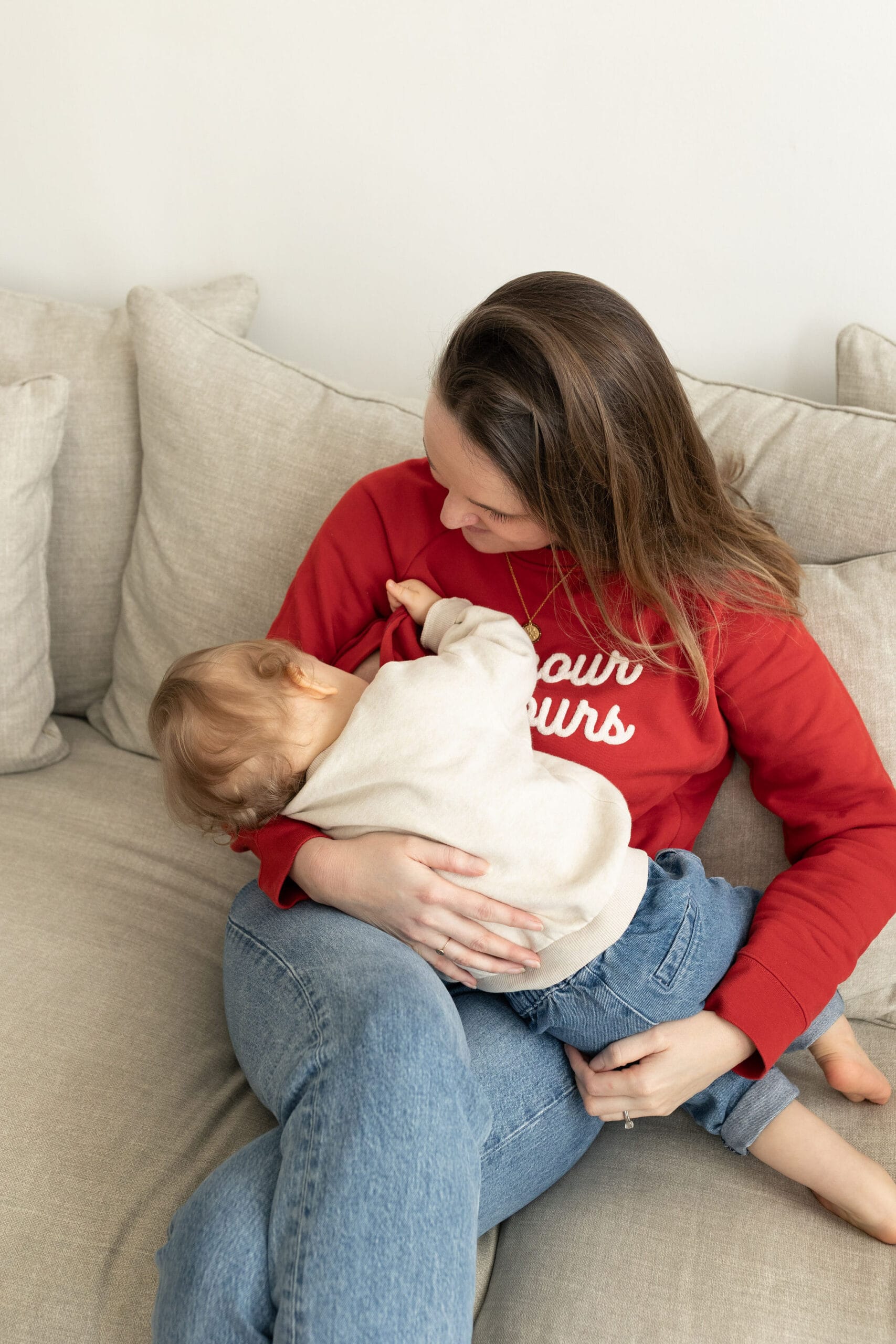 Notre sweat d’allaitement iconique est de retour en version rouge flamboyante, et avec bien sur de l’amour, toujours ♡!
