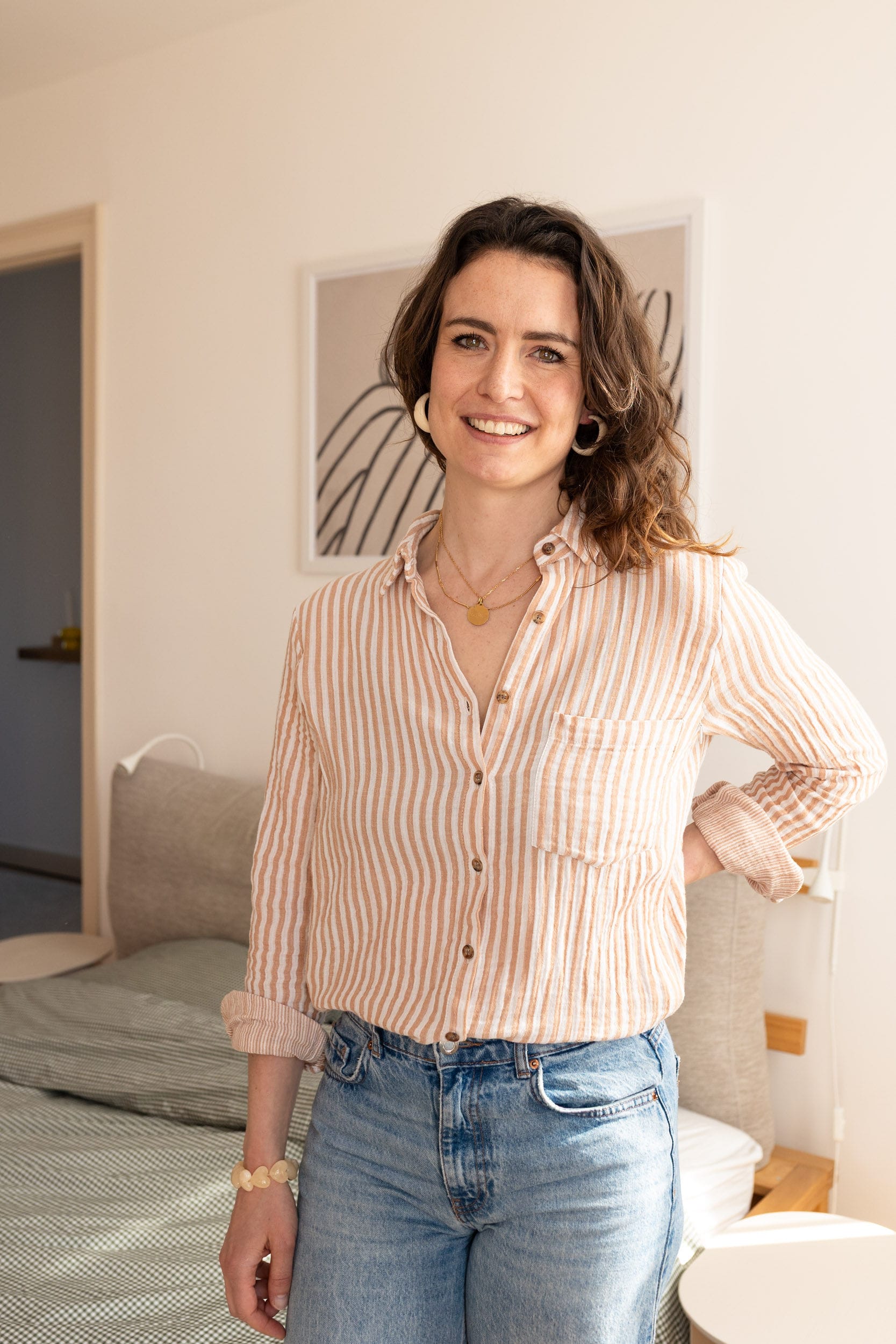 Chic avec ses jolies rayures beige en restant casual, nous l’avons imaginée pour aller bosser, pour un resto sans prise de tête ou juste pour rester à la maison. Petit détail qui fait la différence, des rayures plus fines se dévoilent lorsque vous retroussez les manches.